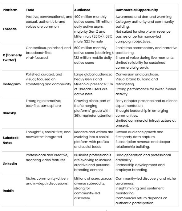 As you can see, each platform rewards a different behaviour. Instagram rewards polish and production. X rewards confrontation and speed. LinkedIn rewards authority. Substack Notes reward depth, and Threads reward presence and humanity. Threads does not replace your existing channels. It influences the earliest stage of perception, where awareness and opinion are formed before consideration or conversion happens elsewhere.