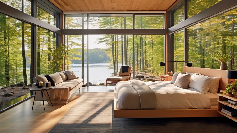 Prompt: photo of Architectural Digest magazine biophilic bedroom, minimalist
