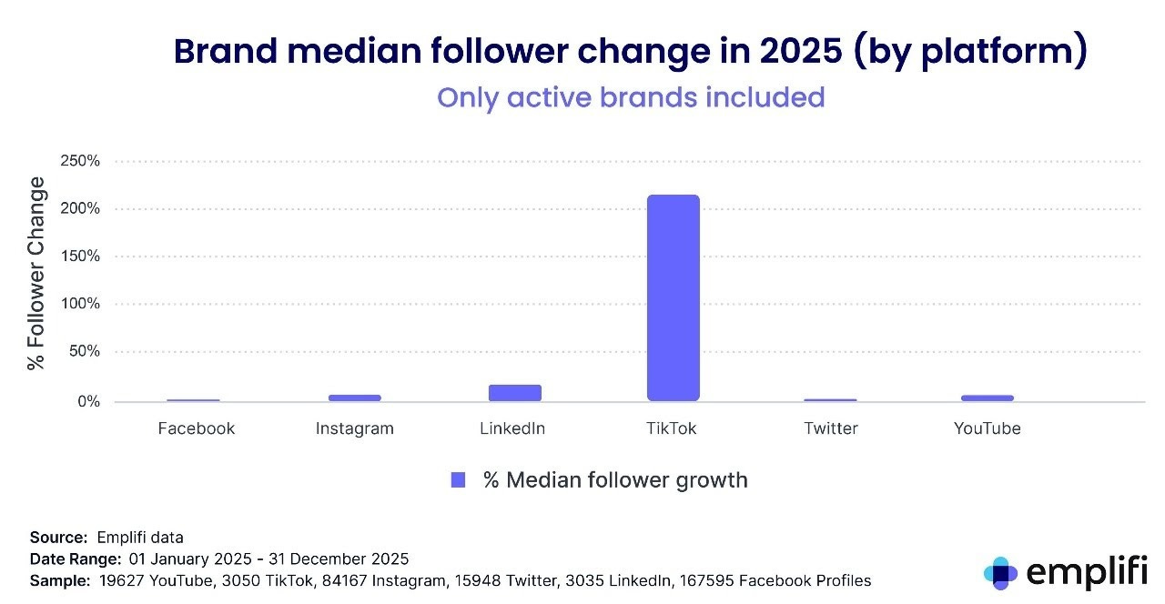 The latest Emplifi data shows a clear difference in how platforms are performing. TikTok brand accounts are growing quickly, with follower numbers increasing by more than 200% year over year, while Facebook growth has stayed largely flat.