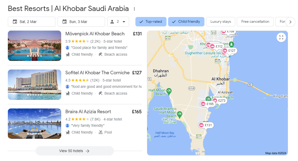 Mark is determined to find the perfect family resort for the annual family holiday. He turns to Google, typing "best family-friendly resort near Khobar." Here, search ads come into play, surfacing options that match his immediate need. The ads here are direct and practical, encouraging action with enticing deals for early bookings. They capitalise on Mark's explicit intent to book and his ready-to-buy mindset.