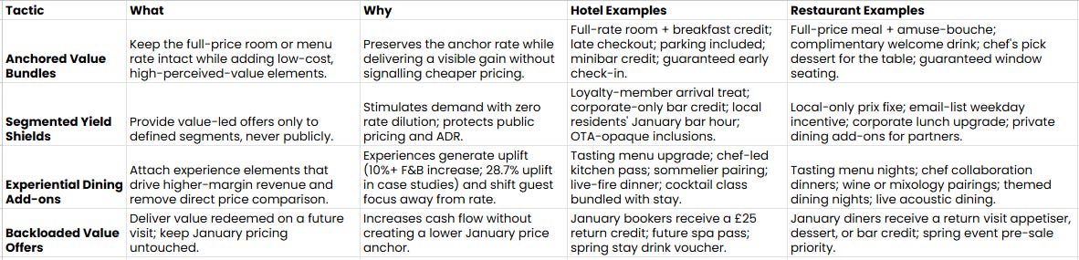 January requires offers that protect the price anchor while still giving guests a compelling reason to book. The most effective tactics increase perceived value without lowering the base rate, ensuring guests remain confident in the normal pricing structure. Behaviour-led packages, anchored bundles and segmented incentives outperform discounting because they create gain without signalling cheaper pricing. Hotels that offer unique dining experiences see an average 10% increase in F&B revenue, and 87% of guests say dining experiences directly influence satisfaction, reinforcing the commercial strength of experience-first value creation.