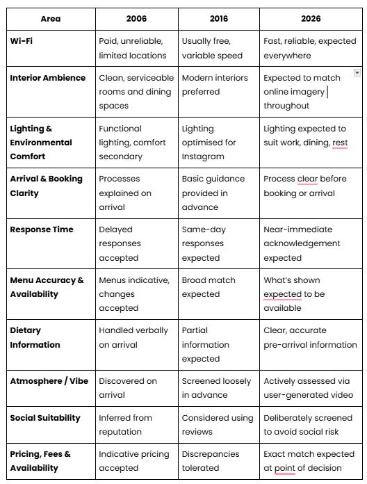 Expectation inflation is most easily observed in what is now considered standard. In hotels and restaurants, elements that once signalled quality or advantage are now assumed. Guests do not register their presence as a value-added service. They register their absence as something going wrong.
