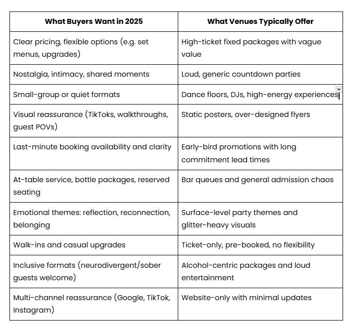 The NYE booking window is getting shorter. Rising costs and the use of AI or online searches to compare options mean many guests are leaving decisions until the last moment. Most will:
