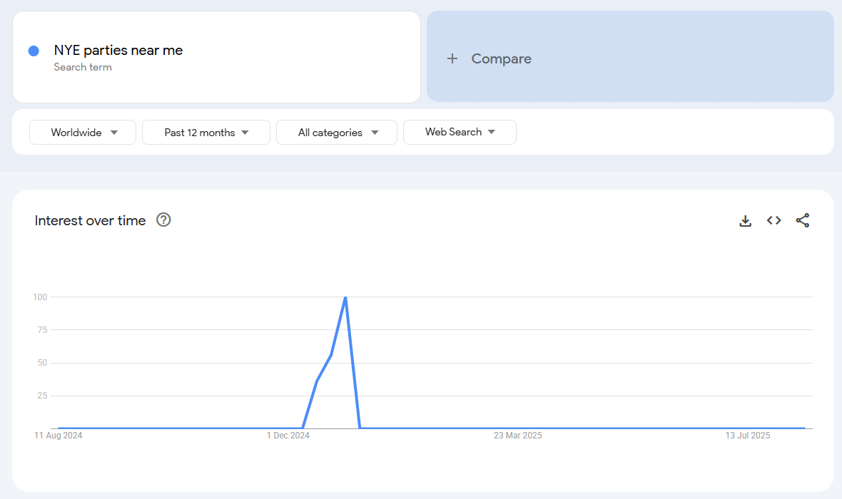 61% of hospitality marketers launch too early, draining budget and attention before the decision window even opens, or too late, missing the surge entirely. Search data shows NYE interest spikes twice: first in early October, then again right after Christmas. This means your campaign requires a two-phase execution strategy. It needs to flex across two distinct booking peaks, each driven by different guest behaviours and emotional triggers.