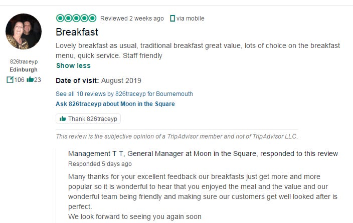 This is an example of a positive review, where the customer has given the restaurant full marks and glowing praise. Moon in the Square has effectively taken the opportunity to increase positive sentiment and customer expectations by responding, thanking the customer for her feedback, and inviting her to return. In most cases, posts like this can be enhanced further by using additional personalisation (the customer’s name).