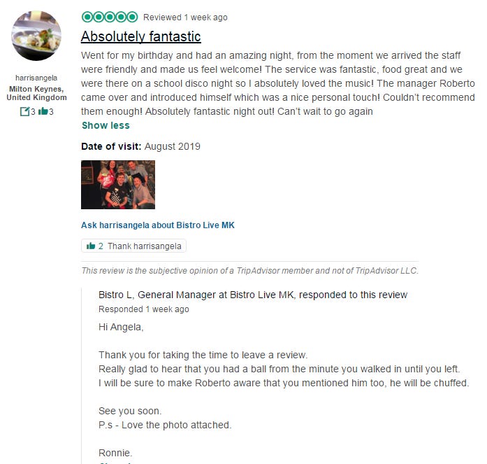 The response from the Bistro Live MK is spot on; they personalised the reply, referenced details, invited the guest to return, and showed they value their staff by promising to pass on the feedback.