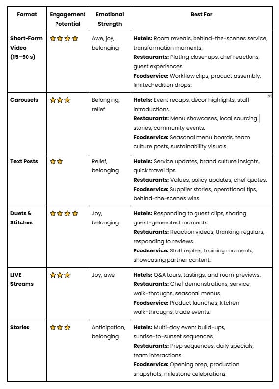 Each format taps into different emotions that shape guest perception. Combine content types in your campaigns to strike a balance between ease of production and emotional impact, creating content that both connects and converts.